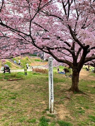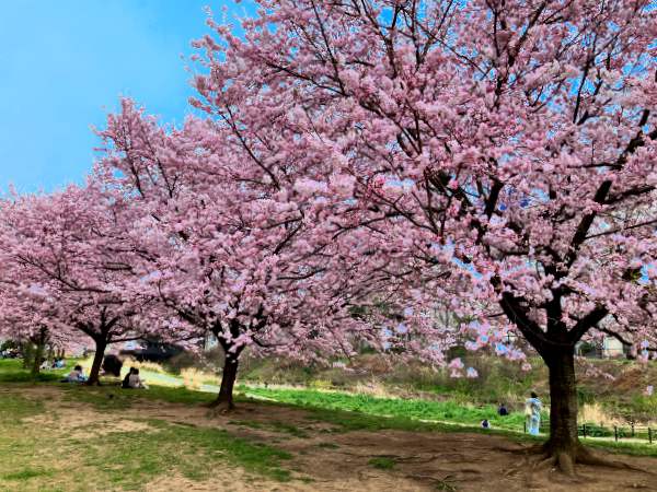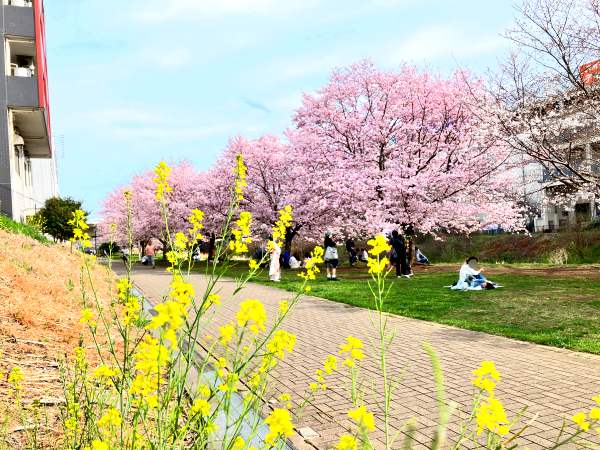 春になると、ソメイヨシノよりも一足早く咲く「神代曙」さくらが川に沿ってとっても綺麗に咲き誇り横浜市都筑区のお花見スポットとして大人気な広場です。