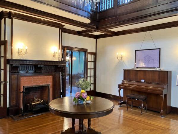 暖炉、ピアノ、シャンデリアが素敵な空間を演出しています。