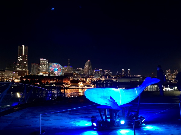大さん橋の屋上ウッドデッキに25mの光のクジラが泳ぐプロジェクションマッピングは見逃せません!